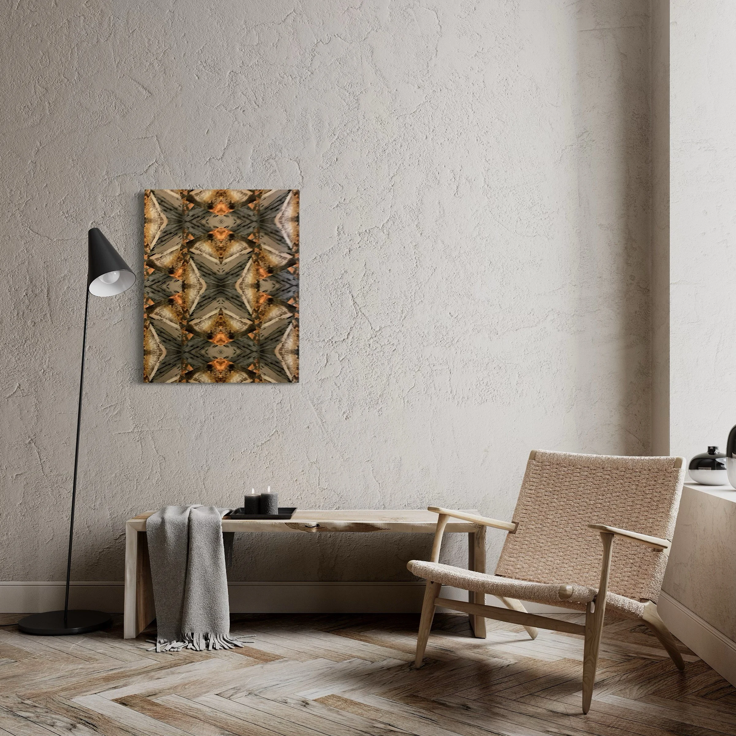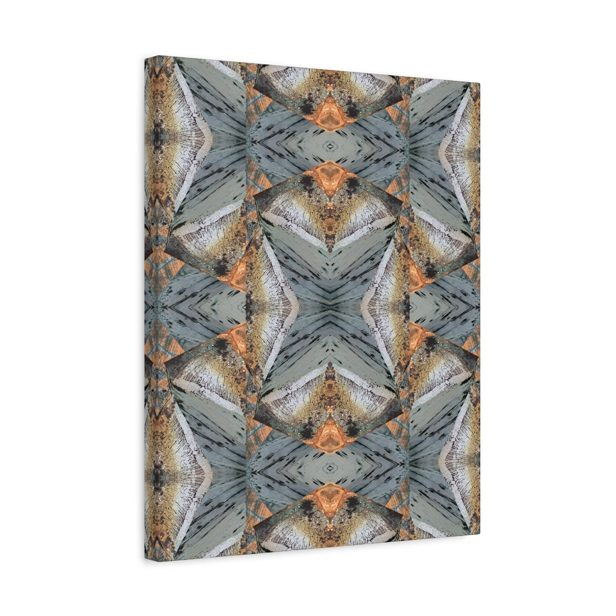 This stretched matte canvas brings a quiet, meditative energy into a room. The repeating, kaleidoscopic pattern — softened blues, warm ochres, and weathered neutrals — feels both organic and architectural, like an abstracted landscape folded into geometric rhythm. Hung over a console or leaning against a bookcase, it calms a cluttered corner and invites closer inspection. The subtle matte finish keeps reflections low so the pattern’s texture reads clearly from different angles. It suits anyone who favors layered, nature-inspired interiors or curated modern spaces and works especially well during a season of home refreshes, gallery-style displays, or when settling into a new place.