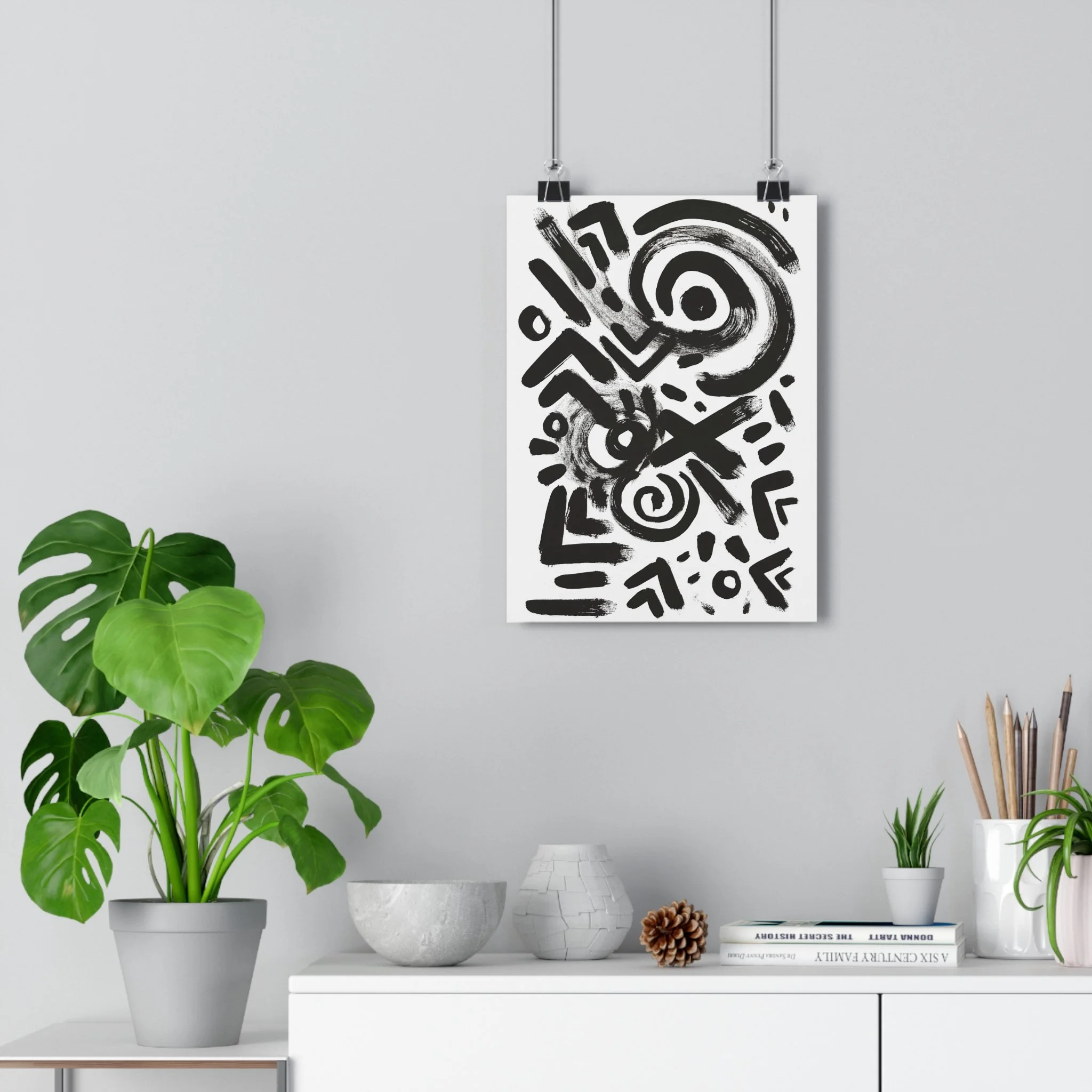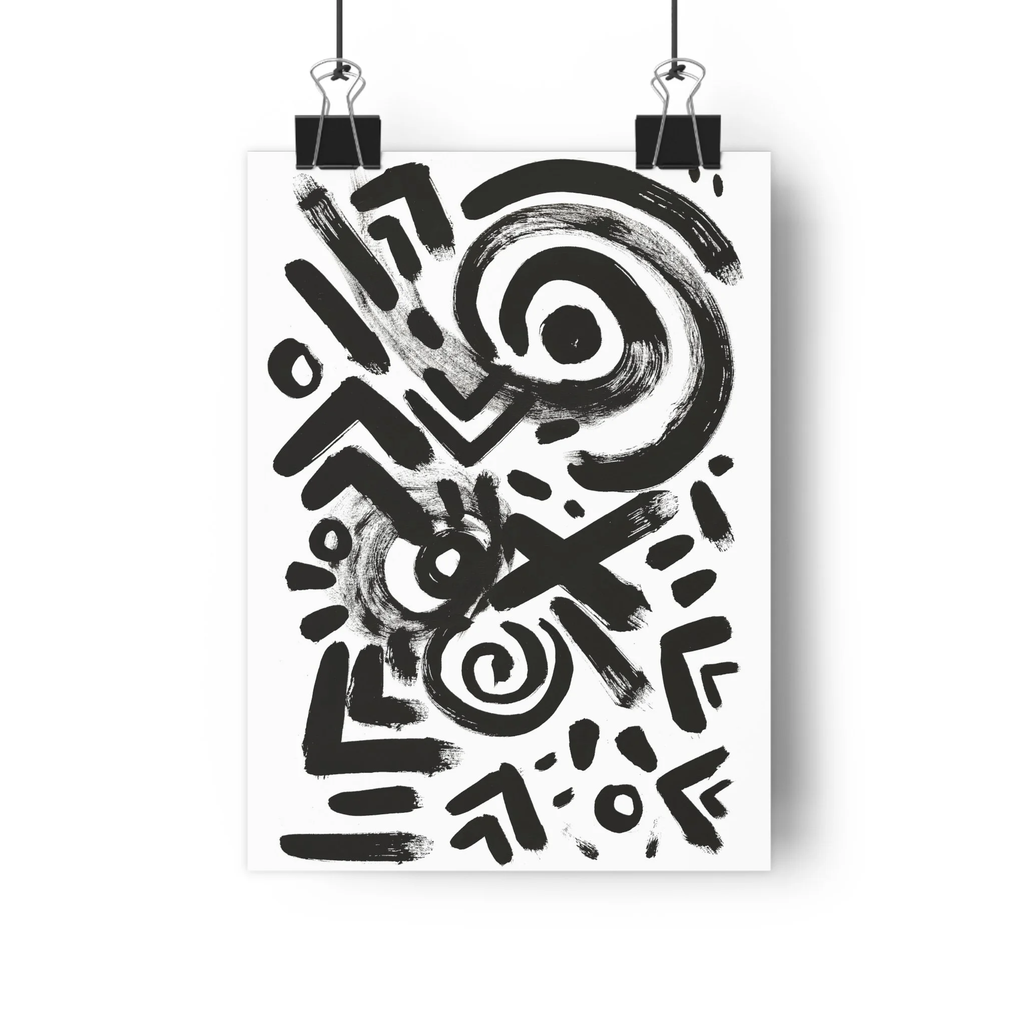 Bold brushstrokes and graphic motion—this giclée art print brings raw, hand-painted energy into quiet rooms. The monochrome design reads like an abstract ritual: spirals, glyph-like marks, and confident swipes that feel both ancient and immediate. Printed with pigmented archival inks on museum-grade matte paper, the contrasts stay crisp and the surface remains soft to the eye. Hang it framed or clipped above a console, in a studio corner, or inside a gallery wall to anchor a modern, minimal, or bohemian space. The striking black-and-white palette complements plants, ceramics, and textured neutrals, giving the room a focused, artistic pulse.